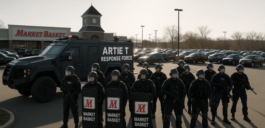 The operation includes a 24-hour police presence at the Gloucester Crossing Market Basket location, rapid-response units stationed on main roadways, and coordinated logistics with volunteer, pro-Artie paramilitary organizations. Officials say the plans for the rapid response were drawn up in the aftermath of the successful 2014 Market Basket protests.