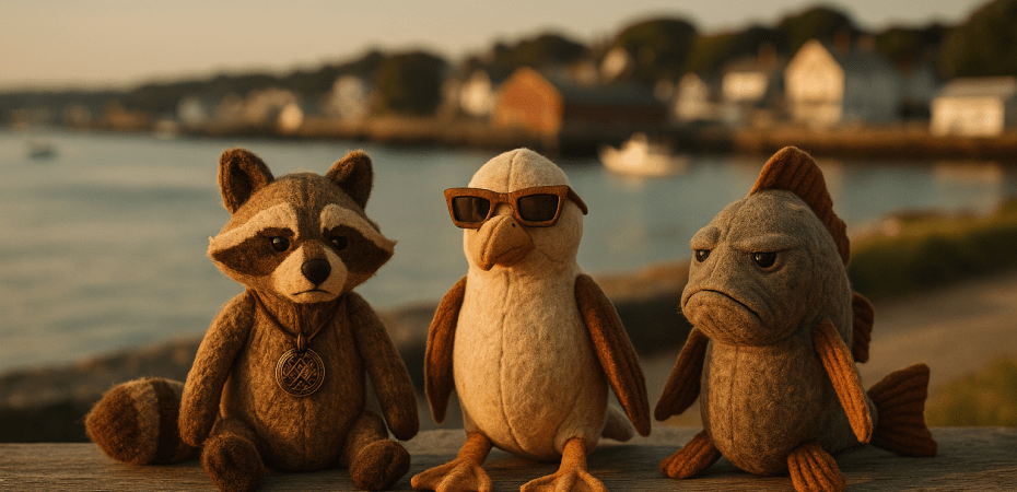 The launch lineup includes a raccoon with a mysterious medallion, a seagull in sunglasses, and a haddock whose expression can only be described as “deeply Gloucester.” According to the anonymous creators — believed to be operating out of a basement in Lanesville — the plush trio “captures the soul of Cape Ann: scrappy, scenic, and kind of fed up.”