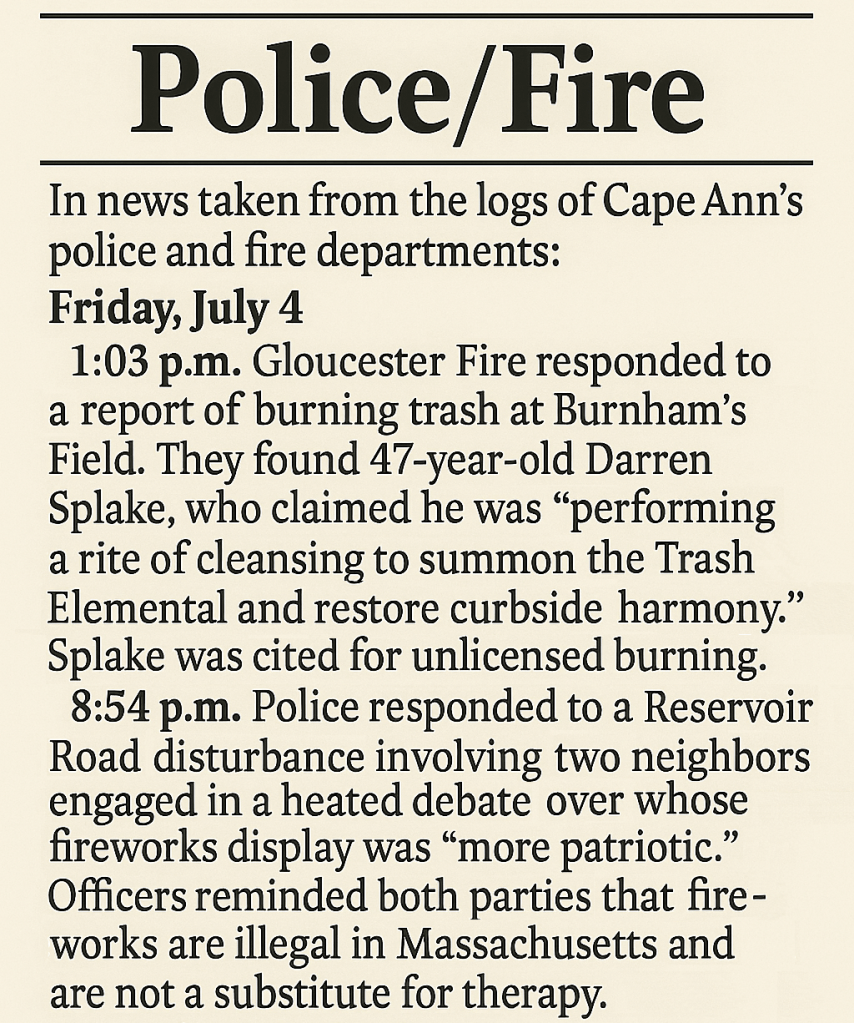 July 5, 2025 The Dogtown Reader Police/Fire — July 4, 2025 In news taken from the logs of Cape Ann’s police and fire departments: Friday, July 4 Follow The Dogtown Reader on Facebook Share this: Share on X (Opens in new window) X Share on Facebook (Opens in new window) Facebook Like Loading... Related