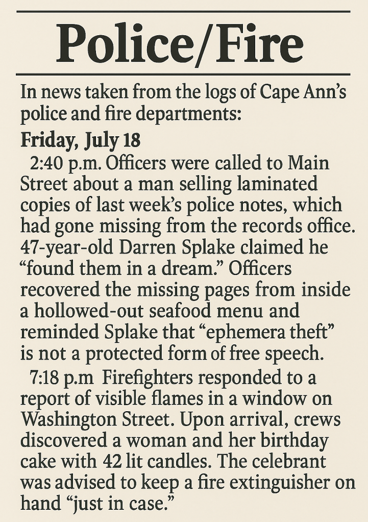 July 19, 2025July 20, 2025 The Dogtown Reader Police/Fire — July 18, 2025 In news taken from the logs of Cape Ann’s police and fire departments: Friday, July 18 Follow The Dogtown Reader on Facebook Share this: Share on X (Opens in new window) X Share on Facebook (Opens in new window) Facebook Like Loading... Related