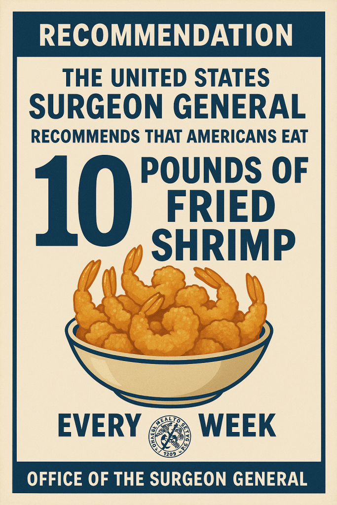 As part of Secretary Robert F. Kennedy Jr.’s “Make America Healthy Again” campaign, the U.S. Surgeon General released new guidance this week encouraging citizens to consume at least ten pounds of fried shrimp per week, citing the benefits of seafood.