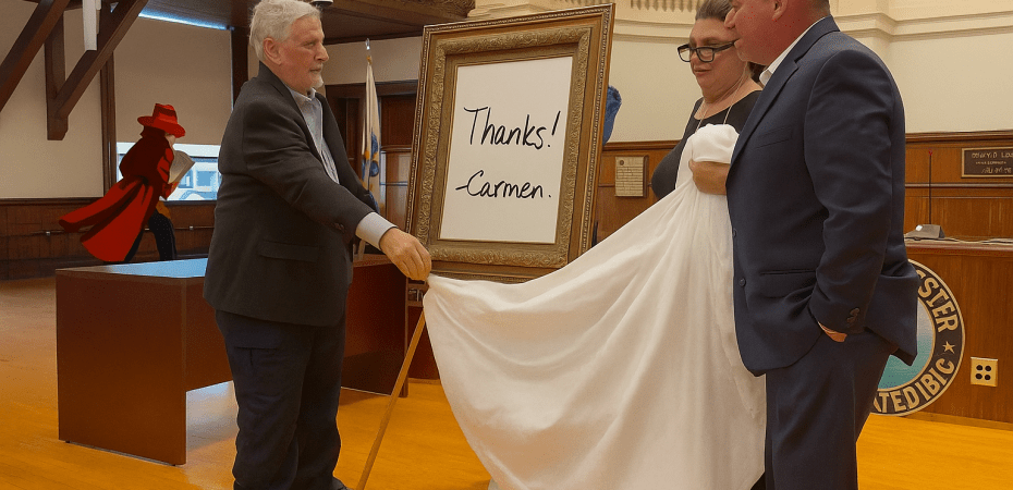 What was meant to be a proud moment of municipal remembrance turned into a civic mystery late Wednesday after the official portrait of former Mayor Sefatia Romeo Theken was discovered missing from its easel upon its unveiling at City Hall. In its place was a handwritten note in the frame that read, “Thanks! -Carmen.”